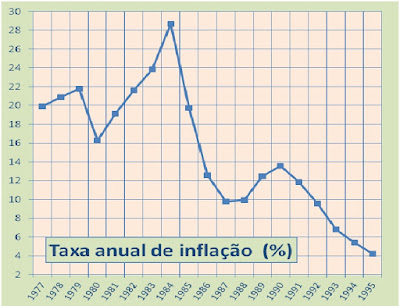 · A inflação mantém-se elevada até 1984, apresentando um ponto mais baixo em 1980, produto da valorização do escudo avançada pelo super-ministro de Sá Carneiro, o fabuloso Cavaco; e que logo se demonstrou ser inconsistente. Tendo num horizonte próximo a adesão à CEE (1986) e a entrada no SME (decidida em 1989 e só concretizada em 1992), Cavaco aproveitou, demarcando-se, do aperto económico da crise financeira de 1983/85, gerida pelo Bloco Central; como se aproveitou da boa conjuntura europeia, do afluxo de fundos comunitários para conseguir baixar a inflação, como imposto por Bruxelas. Após um recrudescimento em 1989/90 a inflação volta a cair acentuadamente até ao final da grande crise de 1993/95 – como exigido pela CEE para a integração no SME - que conduziu à saída de Cavaco e do PSD do governo.